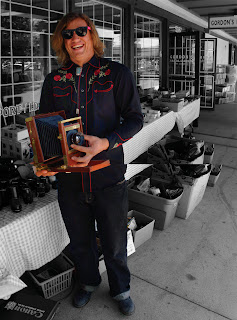Today is a strange day at Gordon’s Photo Center. Outdated camera equipment is strewn about and a done-up young man in black helps customers with UV Filters and NFL-endorsed camera bags. This is Asa Gilmore, this week’s NFF. Asa has worked here for two and half years and said he quit back at Christmas. But for liquidation sales like this one he comes out of the wood work to blast Eagles of Death Metal , wear killer fiddy cent shades, and slang merch.