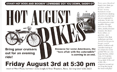 #3 – Reno Critical Mass Hot August Bikes!!! And don’t you dare miss Reno’s premier cycling event of the year! We will be meeting at West Street Plaza at 5:30pm On Friday August 3rd and our bikes will take back the streets of Reno!