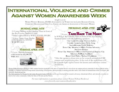 The most excellent UNR organization Women Without Borders is hosting an event this evening (17 April 08) called “Take Back the Night” in conjunction with STAND (Students Against Genocide), Crisis Call Center, American Association of University Women and the Subcommittee for Women for the Student Advisory Board for the Latino Research Center.